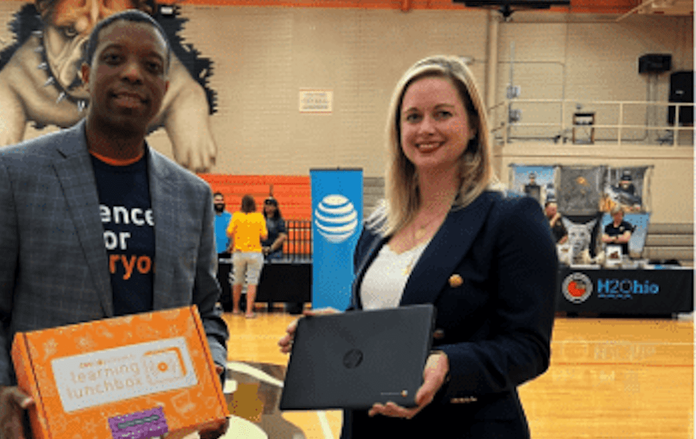 As COSI revived their outreach in East Palestine, AT&T began a collaboration with them. AT&T Ohio President Molly Kocour Boyle joined COSI Vice President of External Affairs Stephen White and Ohio EPA Director Vogel in East Palestine to give something new to COSI that they could include as part of their local delivery: 250 Chromebook computers from nonprofit device provider Human-I-T.