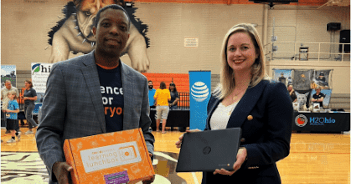As COSI revived their outreach in East Palestine, AT&T began a collaboration with them. AT&T Ohio President Molly Kocour Boyle joined COSI Vice President of External Affairs Stephen White and Ohio EPA Director Vogel in East Palestine to give something new to COSI that they could include as part of their local delivery: 250 Chromebook computers from nonprofit device provider Human-I-T.